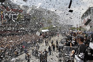 LOS ANGELES, Calif. – A celebration 45 years in the making ended in a blizzard of silver-and-black confetti when the Los Angeles Kings showed off the Stanley Cup.