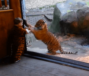 Just south of the boarder in Tacoma, Washington at the Point Defience Zoo, a little guy in a tiger suit had a blast with young tiger. %%video1%%