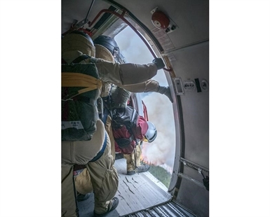 Standing on the edge of an open aircraft hatch, a smokejumper in a pale yellow…