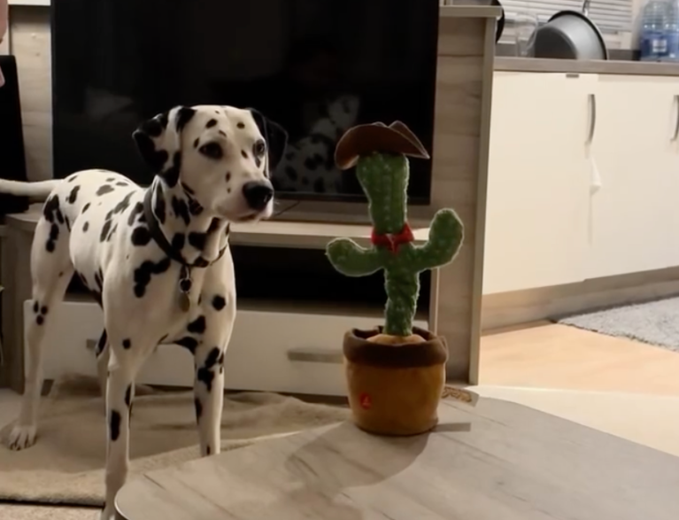This cactus toy will repeat whatever you say to it, so this Dalmatian gets into…