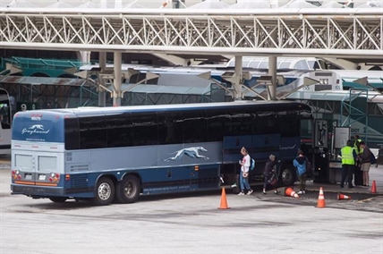 A Greyhound bus pulled over to the shoulder with dozens of passengers standing outside the…