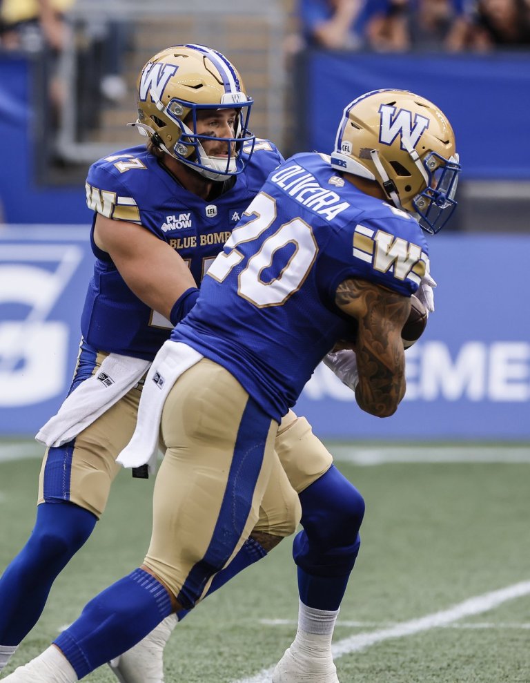 WINNIPEG — Brady Oliveira was at Blue Bombers practice on Monday, but the star running…