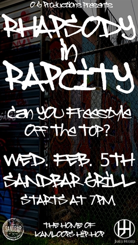 Rhapsody in RapcityIt’s been a while, I shouldn’t have left you, Without a dope rhyme to step to…………Kamloops A.lso K.nown A.s Rapcity were back in effect and better than ever. New speakers new sneakers and all that ish….Lets get it poppin at Sandbar Grill on Wed. Feb 5th for Rhapsody in Rapcity…….JAMES HUGHES Unreleased Album Listening Party at 7:30 – 8:15pmRap Music All Night Long…………..Win PRIZES!!!! HAVE FUN!!!! PARTY ON!!!!!!!!!!!RHAPSODY IN RAPCITY KAMLOOPS…..Olivia Grace Productions