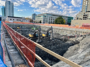 Normally, given the high water table in downtown Kelowna, large buildings are built over surface parking podiums but UBCO is digging the equivalent of four storeys deep in order to build underground parking for its 43-storey tower.