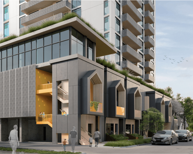 The "rationale" the applicant refers to also includes a narrower tower, a lower podium which includes four live-in artist townhouse/studios and its proposed modular construction.