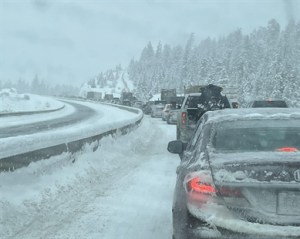 A video shared to Twitter by amateur weather reporter Brad Atchison shows an offramp in North Vancouver full of stuck cars.