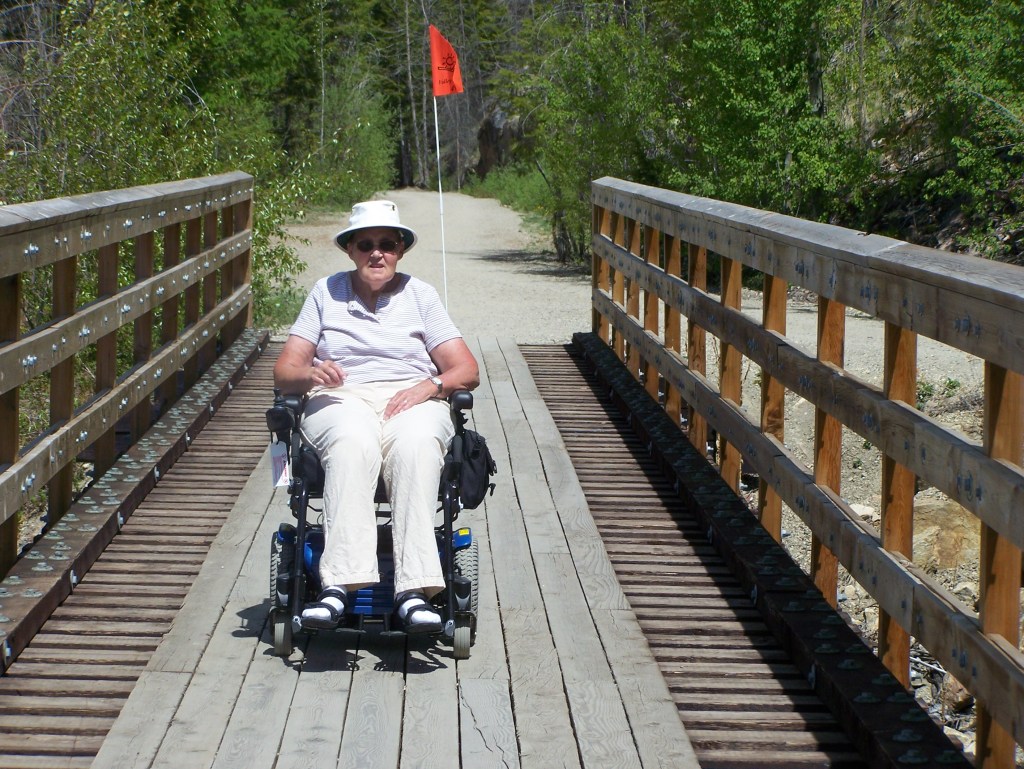 Not one to be held back, she wheeled along the Kettle Valley Rail Trail from Trout Creek in Summerland up to the second trestle past Chute Lake much of the way up Munson Mountain and Bob would drive her to places like the top of Apex Mountain so she could get out and about.
