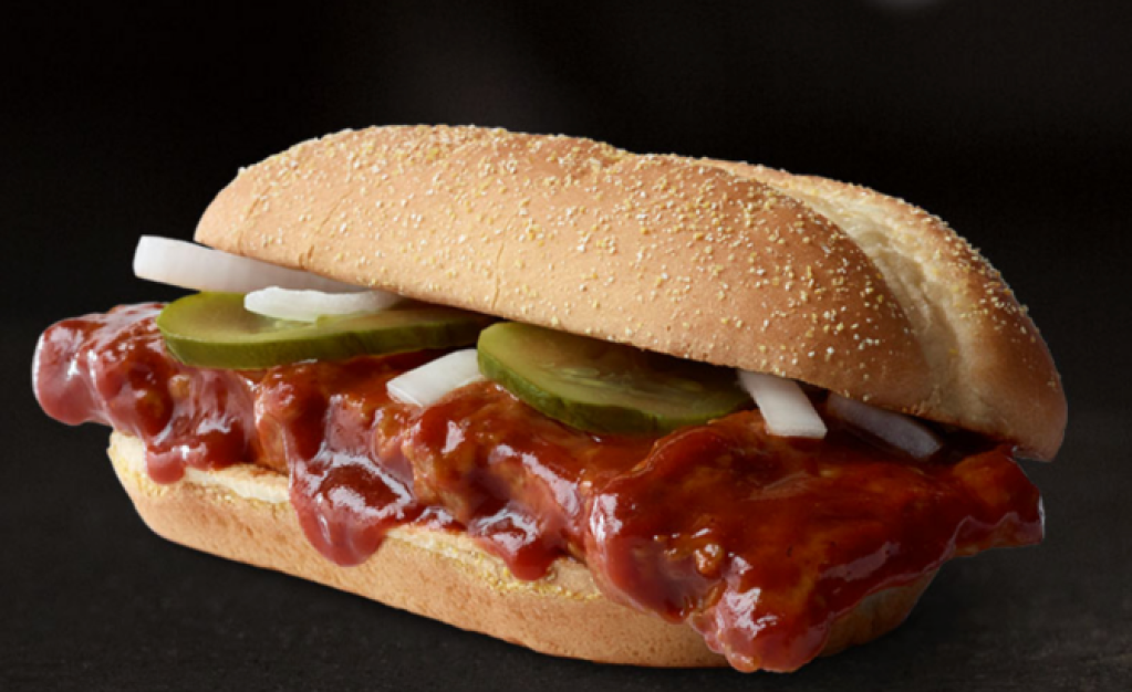 The McRib is made up of a boneless pork patty covered in BBQ sauce accompanied by pickles and onions and served on a bun. Some say it's the perfect mix between sweet, tangy and savoury flavours.