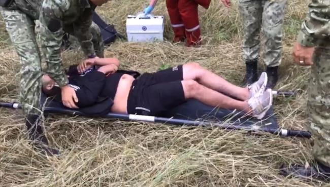 Belarus state TV posted an image of Belarusian border guards standing in a line to close the border while a migrant with a child sits at their feet.