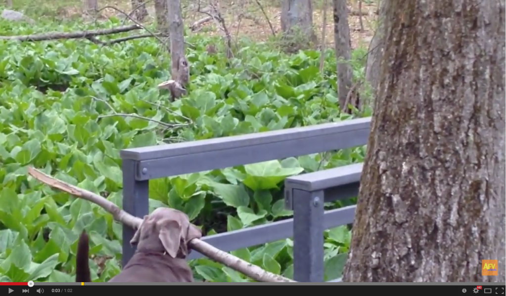 This problem solving pup figures out what to do when you have a big stick and a narrow bridge.