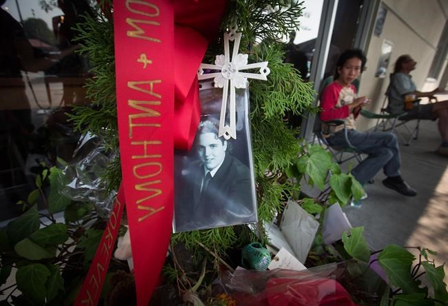 BURNABY, B.C. – Outside a busy Starbucks in Metro Vancouver, a black-and-white photograph of a young man in a suit and tie sits nestled among flowers, handwritten cards and a bright red ribbon that reads, “Michael.”