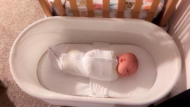Babies are zipped into a mesh sleep sack after a broad cotton swaddle tightly pins the infant’s arms to the side from shoulder to wrist. The sack is then secured to the Snoo’s frame before the rocking and a white-noise lullaby commence.