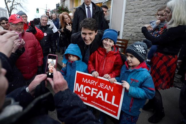 On a quick afternoon outing, Trudeau and Mary Jean McFall first greeted supporters at a coffee shop in Kemptville, just south of Ottawa, where about 75 people in an overflow crowd waited outside in damp snow for selfies and handshakes.