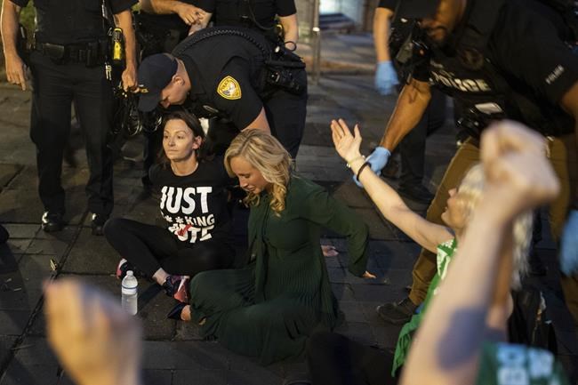 In a news release, the Tallahassee Police Department said that protesters against the abortion ban were told they would have to leave after sunset, but 11 people refused to go and were arrested for trespassing. They did not identify them by name.