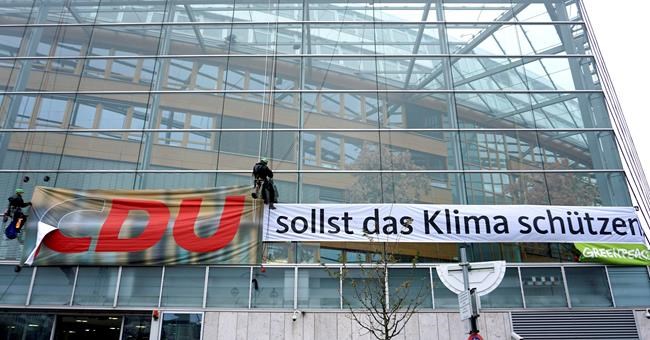 Members of Greenpeace waltzed into the CDU building in downtown Berlin in the morning and snatched the 2-meter-tall (6.5-foot-tall) letter from inside the glass. To the remaining “DU” — German for “you” — they added a banner reading, “should protect the climate.”
