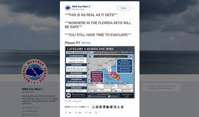 “(asterisk)(asterisk)(asterisk)THIS IS AS REAL AS IT GETS(asterisk)(asterisk)(asterisk)NOWHERE IN THE FLORIDA KEYS WILL BE SAFE(asterisk)(asterisk)(asterisk)YOU STILL HAVE TIME TO EVACUATE(asterisk)(asterisk)(asterisk)” The National Weather Service’s Florida Keys office tweeted Friday.