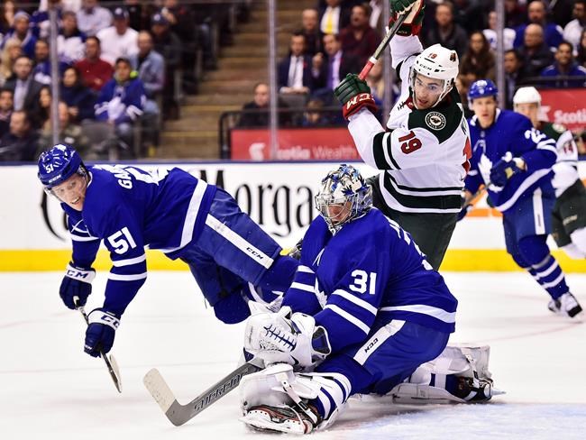 Jason Zucker tied the game for Minnesota with 1:45 to play in the first, banging in a rebound from the top of the crease on a play that started with Toronto turning the puck over behind its net.