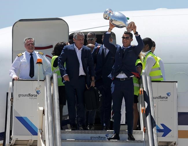 Captain Cristiano Ronaldo and coach Fernando Santos held the cup up to great cheers on stepping out of the plane.