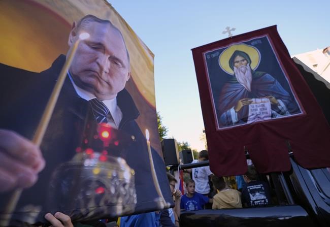 The procession called by the conservative Serbian Orthodox Church and led by its clergy included anti-Western slogans as well as Russian flags and portraits of Russian President Vladimir Putin.