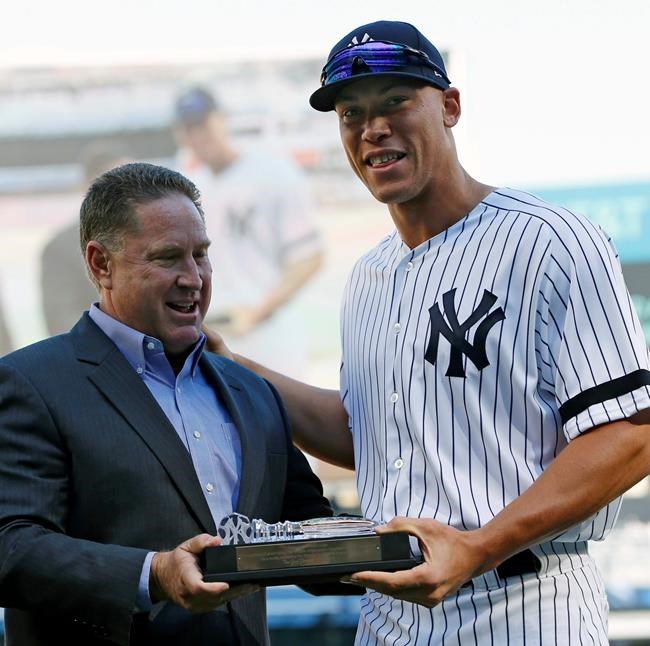 Before the game, Judge was presented with a Waterford Crystal “gavel” for setting the franchise record for home runs by a rookie. Judge broke Joe DiMaggio’s mark when he connected on his 30th of the season July 7. He was rested against Toronto and finished his outstanding season with 52 home runs , a major league record for rookies.