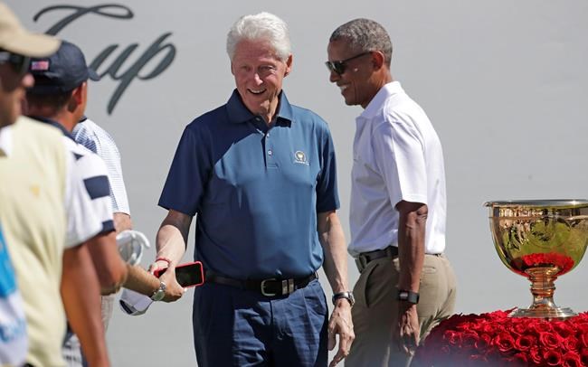 JERSEY CITY, N.J. – The start of the Presidents Cup gave golf a new Big Three — former Presidents Barack Obama, George W. Bush and Bill Clinton posing with players and wives on each team in an opening ceremony unlike any other.
