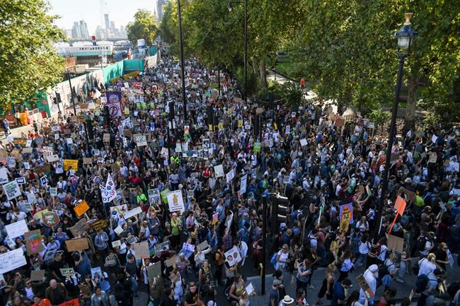 A large crowd filled London’s government district, and there were also rallies in U.K. cities including Birmingham, Glasgow and Belfast, as part of a “Global Climate Strike.”