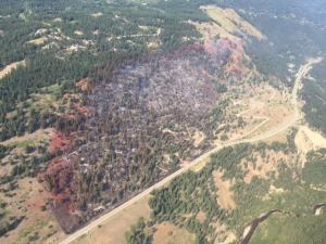 An aerial photo from B.C. Wildfire shows how quickly a fire can spread and threaten homes. The fire clearly started off Highway 33, likely from vehicle traffic and burned into higher elevations.