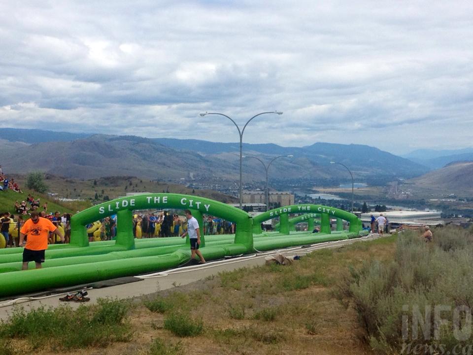KAMLOOPS – The clouds and cool temperatures aren’t deterring the hundreds of people lining up for an epic slip and slide on Hillside Drive in Kamloops today.