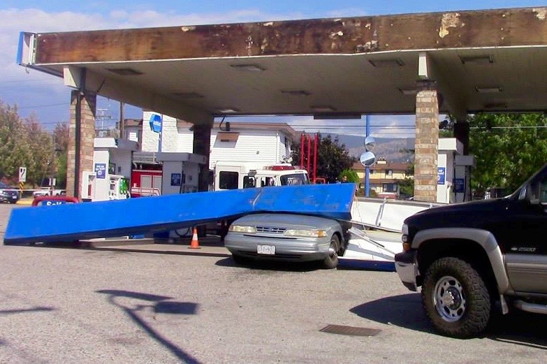 The signage above the gas pumps at the Husky station at the corner of Skaha Lake Road and Kinney Avenue let loose and smashed onto a car getting filled up around 2:30 p.m., Sept. 6.