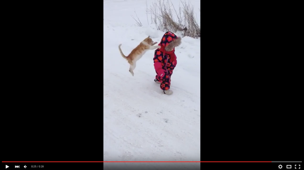 Watch a frisky, little kitty tackles a kid out for a walk in the snow in her winter garb.