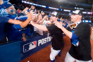 "He's all swung out and his arm is tired from high-fiving people." Benn Wood, the father of a nine-year-old boy who dressed up as Jays slugger Jose Bautista, and mimicked his moves, becoming a North America media darling during the team's post-season play.