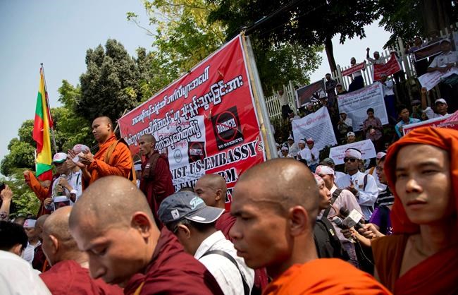YANGON, Myanmar – Buddhist monks joined several hundred protesters outside the U.S. Embassy in Myanmar on Thursday to demand it stop using the term “Rohingya” to refer to a Muslim ethnic minority group.