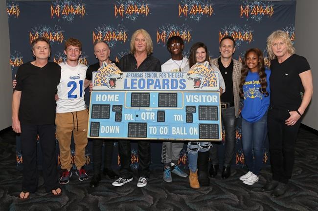 The group posed for photos holding a replica of the school’s scoreboard and in front of a banner emblazoned with the band’s name. The band later posted them on social media with the caption “Arkansas Deaf Leopards and #DefLeppard.”
