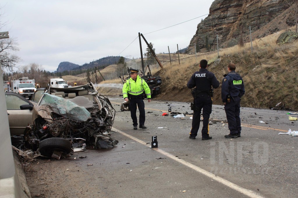 RCMP say the crash happened at about 1 p.m., Jan. 24, at the north end of Vaseux Lake. A Toyota Corolla crossed the centre line and hit an oncoming logging truck head-on.