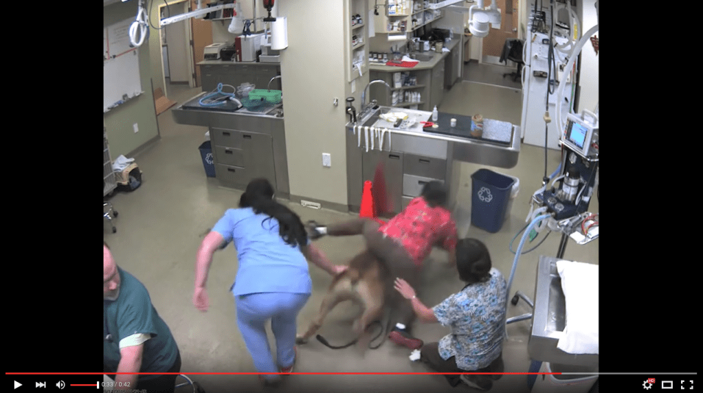 In this case, staff at the vet clinic are trying to hold a big dog still for a procedure and he's having none of it.