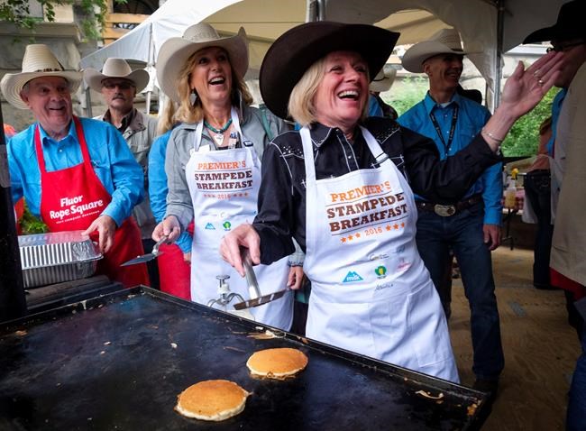 Notley made her remarks after flipping and serving up pancakes at the annual premier’s Stampede Breakfast in downtown Calgary. It was her second year holding the event, which drew a crowd despite heavy rain.