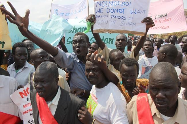 JUBA, South Sudan – South Sudan’s government on Wednesday organized a protest against the deployment of foreign troops to secure its capital after recent clashes between opposing army factions left hundreds dead.