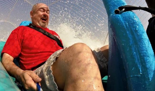 In early tests, rafts carrying sandbags flew off the slide, prompting engineers to tear down half of the ride and reconfigure some angles. A promotional video about building the slide includes footage of two men riding a raft down a half-size test model and going slightly airborne as it crests the top of the first big hill.