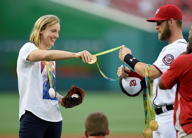 Bryce Harper, last year’s NL MVP, accompanied Ledecky to the pitching mound, which came in handy when the swimmer decided to shed the five medals — four golds and a silver — she captured in Rio, two of them in world-record times. It was the most successful showing by a female athlete in U.S. Olympic history.