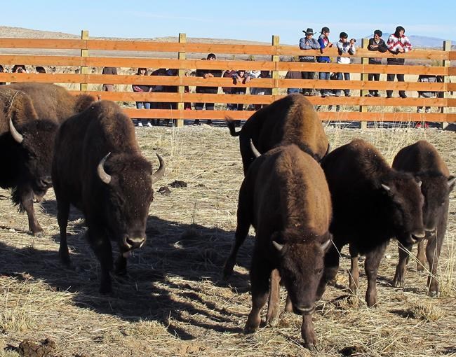 The 10 buffalo released Thursday are from a genetically pure strain the federal government maintains on a refuge in Iowa. The National Wildlife Federation and U.S. Fish and Wildlife Service have worked with the Eastern Shoshone on the restoration project.