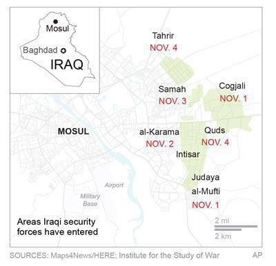 Iraqi forces have made uneven progress since the operation to retake Mosul began on Oct. 17. The territory they have retaken inside Mosul is just a small fraction of the city, which measures more than 9 miles (15 kilometres) across.