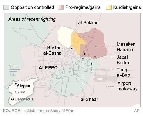 The new advances also secure the airport road east of Aleppo, leading to the city’s international airport and a military airbase. The pan-Arab Mayadeen TV station said intense bombing in eastern Aleppo was designed to ensure rebels have been cleared from the airport road.