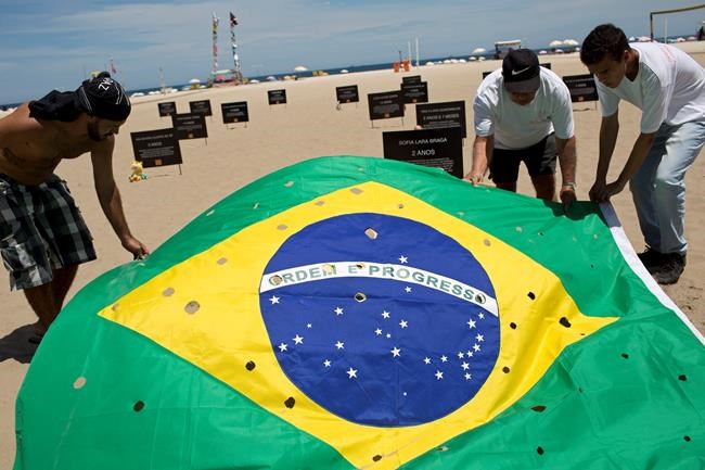 The Rio de Paz group has also spread over the sand a large Brazilian flag with several holes representing bullets.