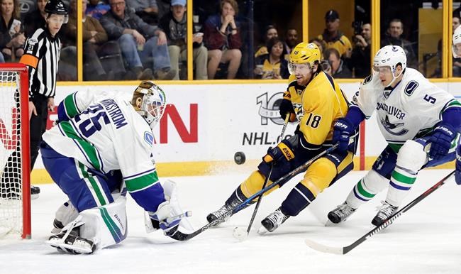 NOTES: Vancouver D Ben Hutton returned to the lineup after missing 11 games with a hand injury. … The Canucks are 11-5-3 when scoring first. … Fiddler played his first game in his second stint with Nashville after being acquired from New Jersey. He played 305 games for the Predators from 2002-09. … It was Arvidsson’s eighth multipoint game of the season.