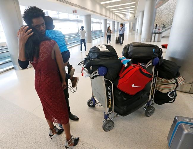 As he made his way out of the airport, his son perched on his shoulders and his daughter rode on the luggage, carrying the flowers he brought as a gift.