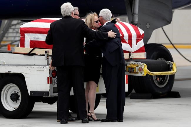 Deborah Crosby walked forward, touched the casket and embraced her three brothers. The aviator’s elderly sister, Sharon, and brother, David, also hugged, and he wiped an eye.