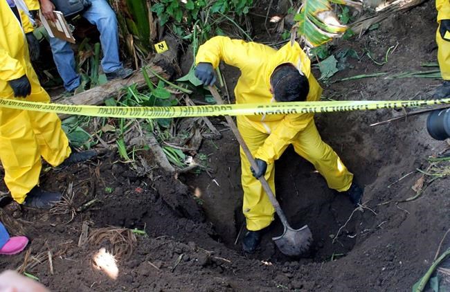 The burial pits came to light when some families searching for missing loved ones found remains on Saturday after receiving a telephone tip from local residents. The first pit contained nine bodies and was located near a stream in a sugar cane field. Trained dogs then led searchers to three other pits nearby.