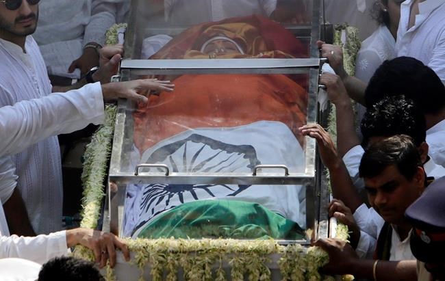 By late afternoon, her body, wrapped in an Indian flag, began its journey from the club to the crematorium where her funeral took place according to Hindu customs. The body was carried in a truck decorated with flowers and a giant poster of the actress.