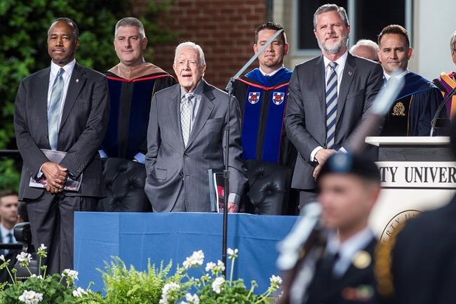 Taking the podium Saturday to a standing ovation a year after Trump spoke to Liberty graduates, Carter took note of the large crowd at the university stadium. He said Liberty President Jerry Falwell Jr. “told me before we came here that it’s even bigger — I hate to say this — than it was last year.”
