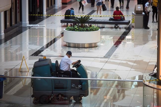 A spokeswoman for mall operator Cadillac Fairview says a water leak, believed to have been caused by the rain, started on the third level of the shopping centre at about 4:30 p.m. and flowed down to the lower levels.